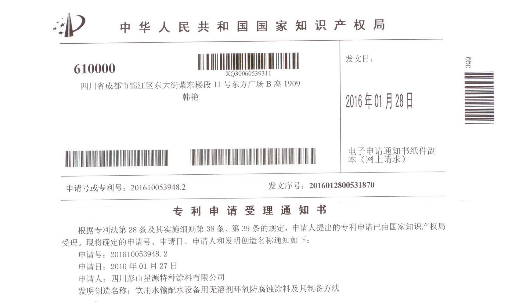 2016年4月6日,四川星源特種涂料有限公司獲得“飲用水輸配水設(shè)備用無溶劑環(huán)氧防腐蝕涂料及其制備方法”的專利申請?zhí)?,屆時川星涂料將多一項在制作IPN8710飲用水無毒涂料的發(fā)明專利。